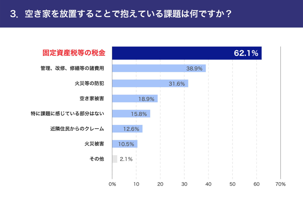 空き家を放置していることで抱えている課題はなんですか?という質問に対し、一番回答が多かったのが固定資産税等の税金、それに続いて管理、改修、修繕等の諸費用と挙げられます。