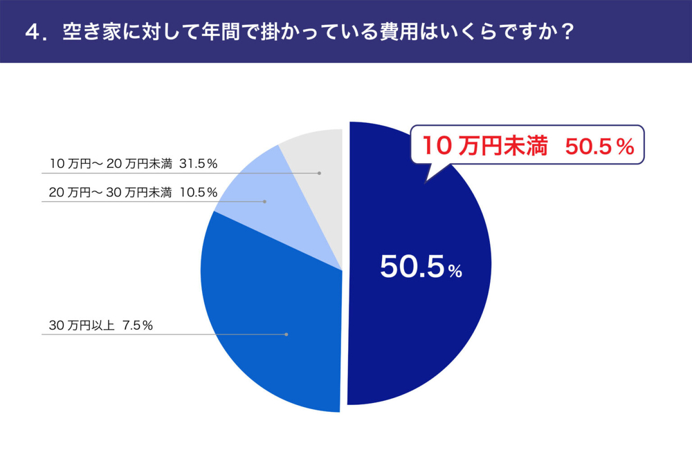 固定資産税、火災保険、管理費、交通宿泊費、庭木の伐採、修繕費等で年間にかかっている費用は約半数が10万円未満ですが、30万円以上かかっている人も7.5%います。